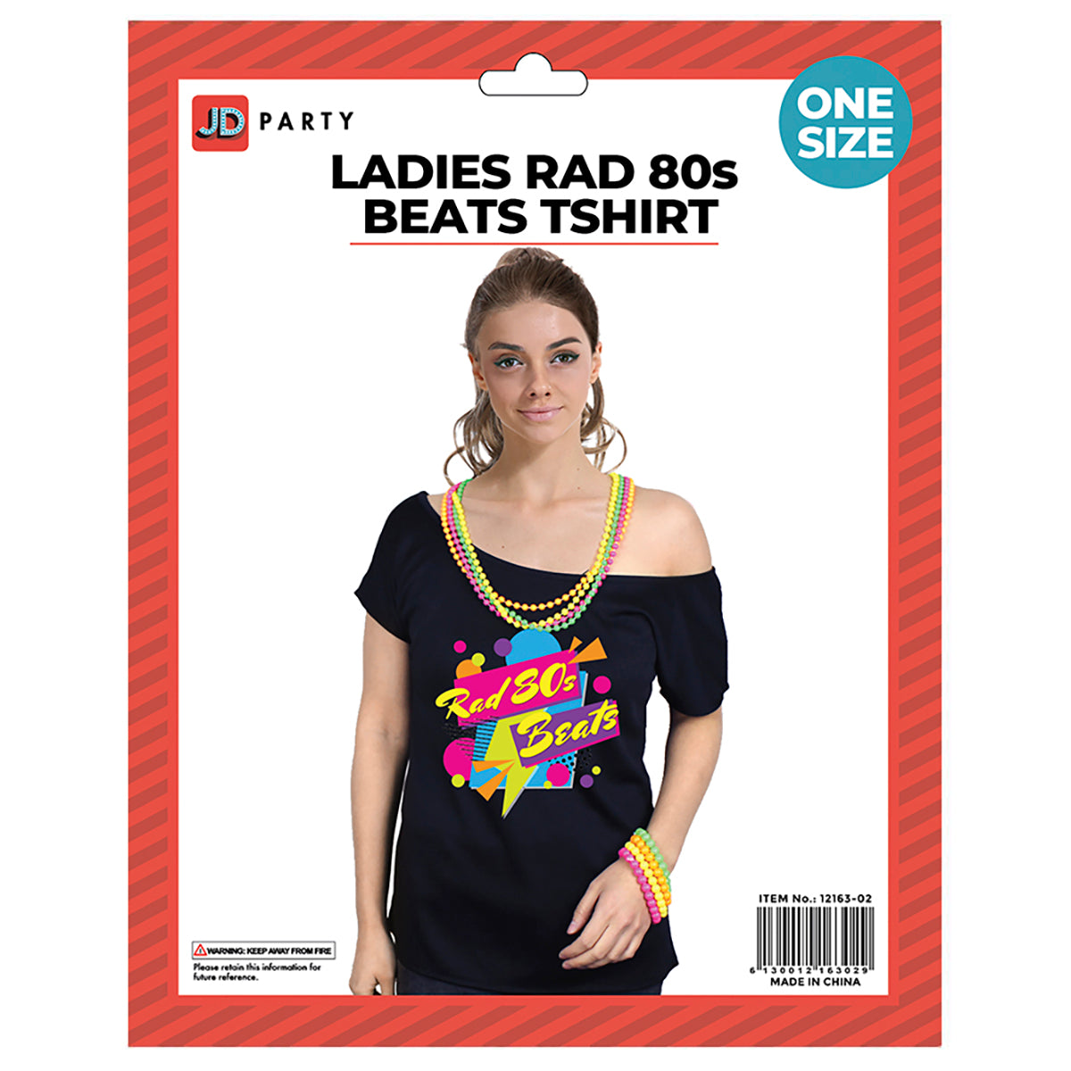 Jump back to the 80's wearing our Adult Ladies Rad 80s Beats Printed T-Shirt! This scoop neck top can be worn off the shoulder, loose or tight or with layers to get your own unique 80s look! Great for your next 1980s Party or any fancy dress party!