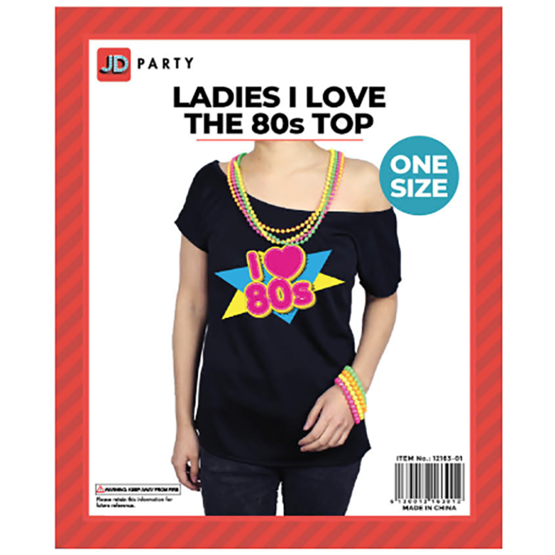 Our gorgeous "I love the 80's" top is sure to bring you back to the party era! Pair with a tutu, fishnets and neon beads