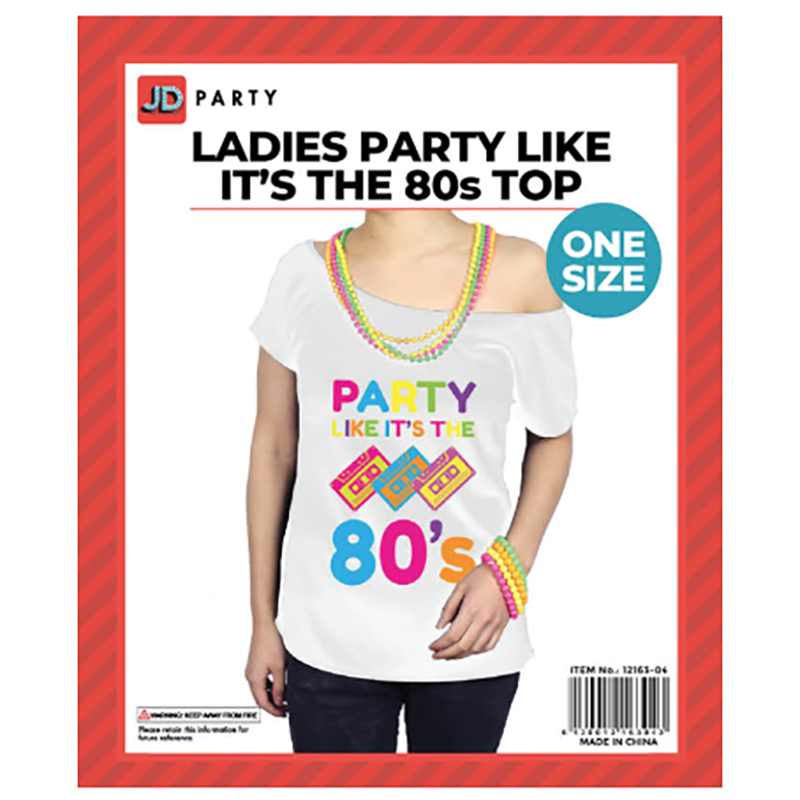 Jump back to the 80's wearing our Adult Ladies Party like it’s the 80s Printed T-Shirt! This scoop neck top can be worn off the shoulder, loose or tight or with layers to get your own unique 80s look! Great for your next 1980s Party or any fancy dress party!