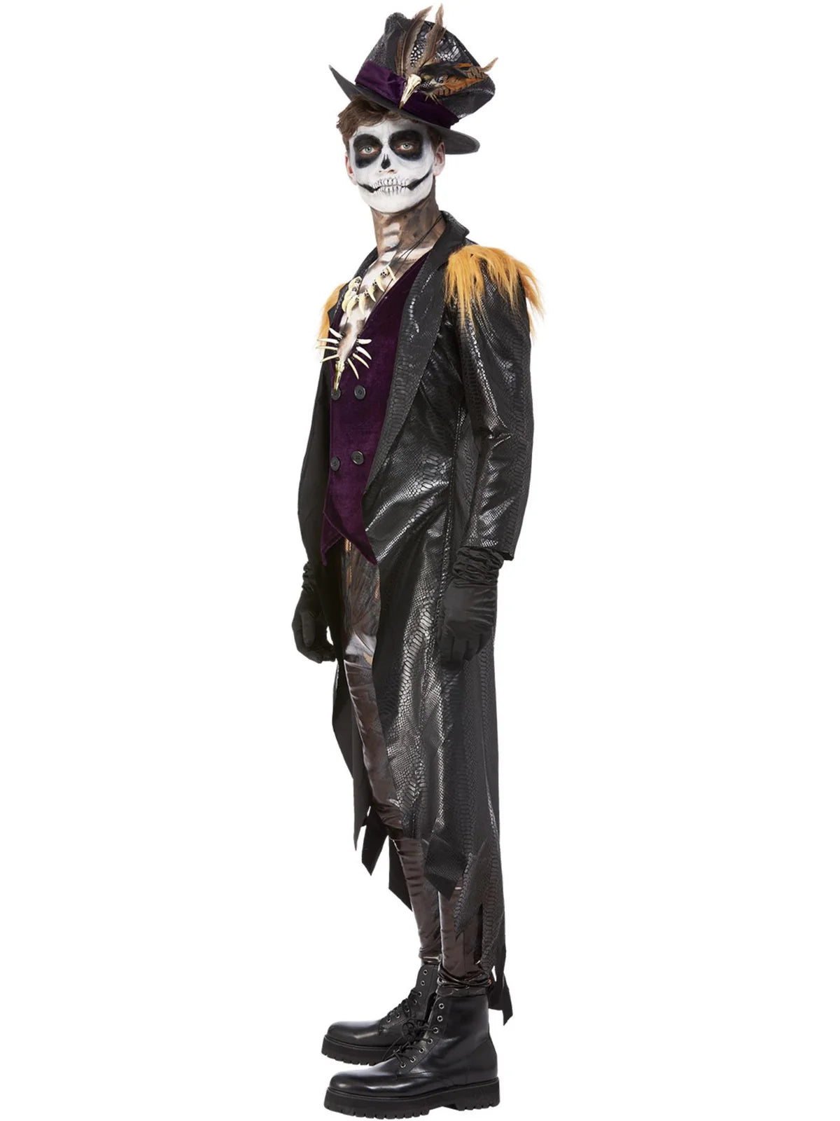 Deluxe Voodoo Witch Doctor Costume, Black & Purple, Jacket, Mock Top, Trousers, Hat & Necklace.